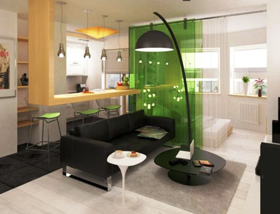 Одним из способов разделения пространства может стать использование разных полов или отделок на стенах. Например, зона спальни может быть выделена темным ламинатом или ковровым покрытием, в то время как гостиная будет иметь светлые отделочные материалы. Такой подход поможет визуально разделить пространство и сделает его более комфортным для использования. Можно использовать глянцевые натяжные потолки, они визуально расширяют пространство.