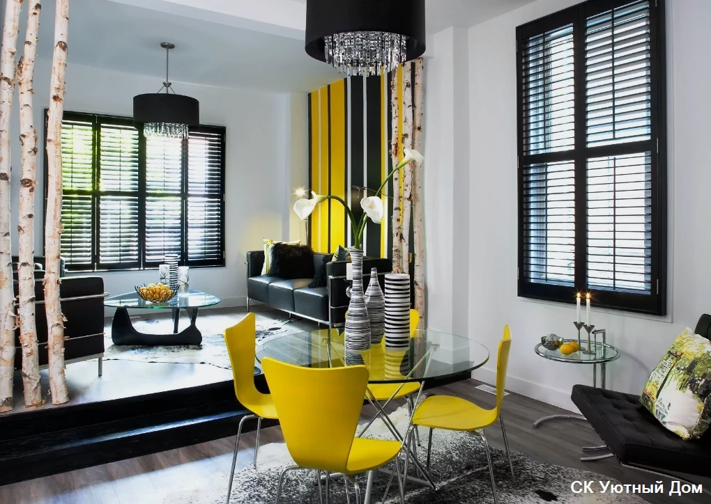 Одним из способов разделения пространства может стать использование разных полов или отделок на стенах. Например, зона спальни может быть выделена темным ламинатом или ковровым покрытием, в то время как гостиная будет иметь светлые отделочные материалы. Такой подход поможет визуально разделить пространство и сделает его более комфортным для использования. Можно использовать глянцевые натяжные потолки, они визуально расширяют пространство.