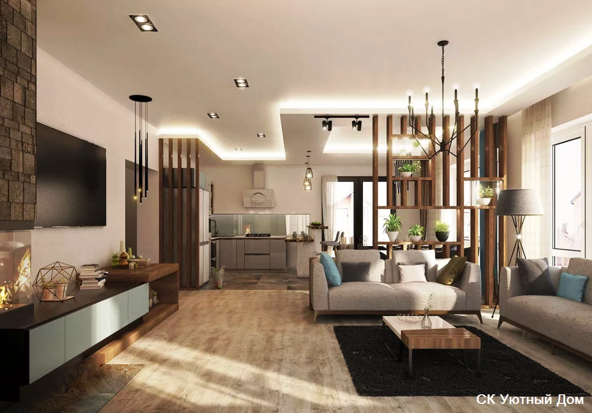 Одним из способов разделения пространства может стать использование разных полов или отделок на стенах. Например, зона спальни может быть выделена темным ламинатом или ковровым покрытием, в то время как гостиная будет иметь светлые отделочные материалы. Такой подход поможет визуально разделить пространство и сделает его более комфортным для использования. Можно использовать глянцевые натяжные потолки, они визуально расширяют пространство.
