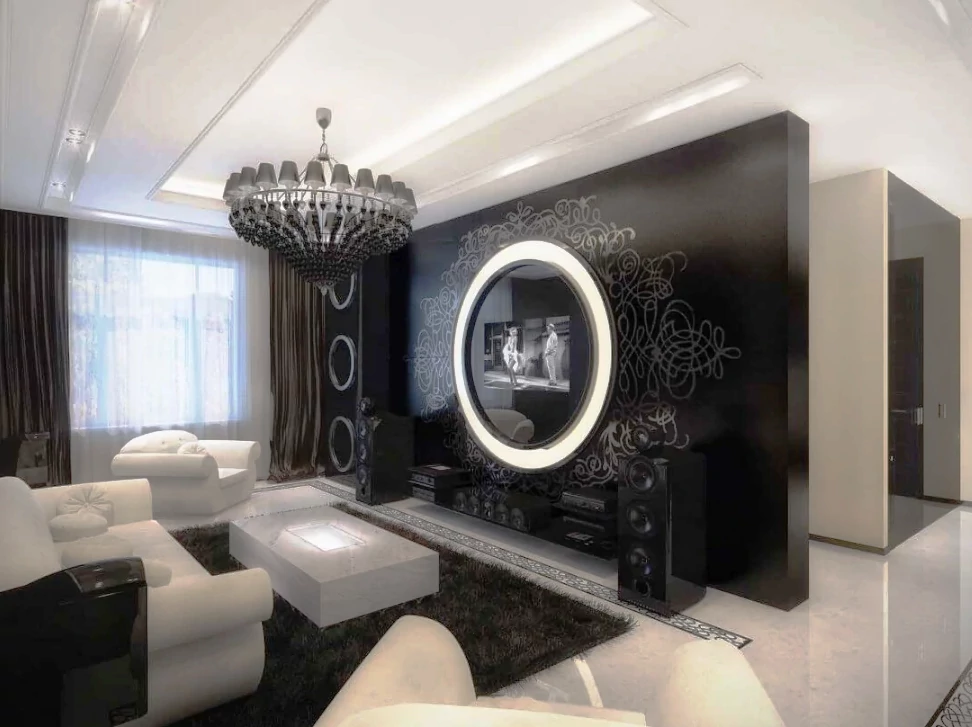 Одним из способов разделения пространства может стать использование разных полов или отделок на стенах. Например, зона спальни может быть выделена темным ламинатом или ковровым покрытием, в то время как гостиная будет иметь светлые отделочные материалы. Такой подход поможет визуально разделить пространство и сделает его более комфортным для использования. Можно использовать глянцевые натяжные потолки, они визуально расширяют пространство.