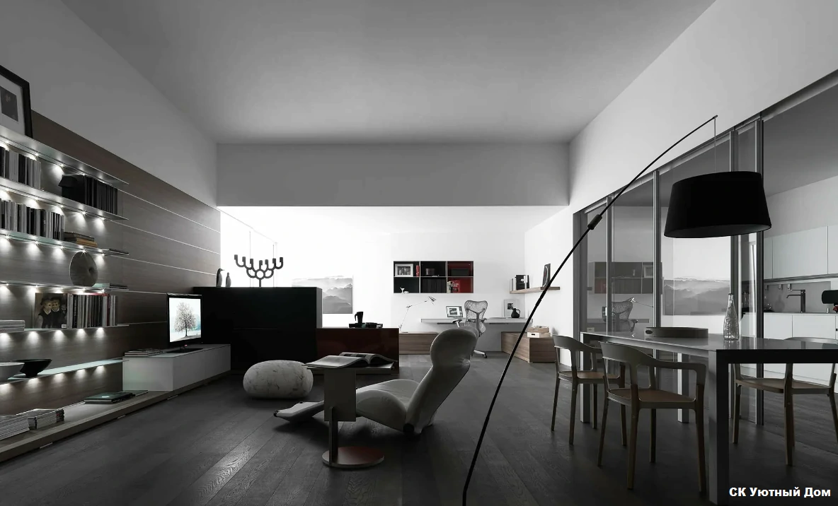 Одним из способов разделения пространства может стать использование разных полов или отделок на стенах. Например, зона спальни может быть выделена темным ламинатом или ковровым покрытием, в то время как гостиная будет иметь светлые отделочные материалы. Такой подход поможет визуально разделить пространство и сделает его более комфортным для использования. Можно использовать глянцевые натяжные потолки, они визуально расширяют пространство.