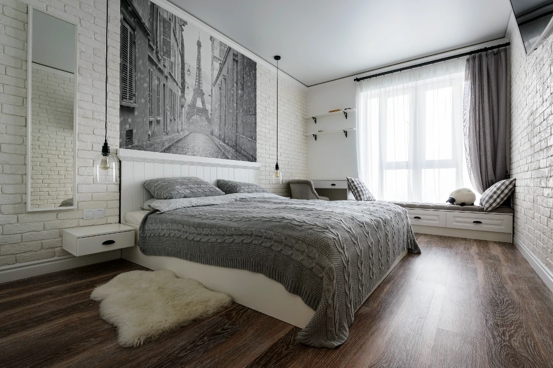 Одним из способов разделения пространства может стать использование разных полов или отделок на стенах. Например, зона спальни может быть выделена темным ламинатом или ковровым покрытием, в то время как гостиная будет иметь светлые отделочные материалы. Такой подход поможет визуально разделить пространство и сделает его более комфортным для использования. Можно использовать глянцевые натяжные потолки, они визуально расширяют пространство.