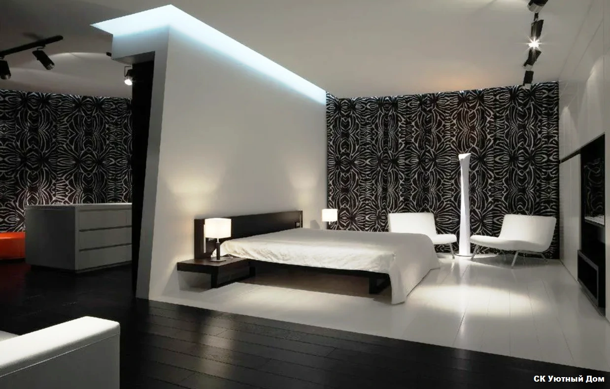 Одним из способов разделения пространства может стать использование разных полов или отделок на стенах. Например, зона спальни может быть выделена темным ламинатом или ковровым покрытием, в то время как гостиная будет иметь светлые отделочные материалы. Такой подход поможет визуально разделить пространство и сделает его более комфортным для использования. Можно использовать глянцевые натяжные потолки, они визуально расширяют пространство.