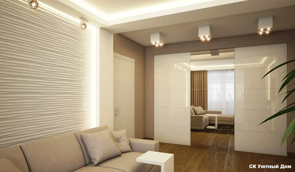 Одним из способов разделения пространства может стать использование разных полов или отделок на стенах. Например, зона спальни может быть выделена темным ламинатом или ковровым покрытием, в то время как гостиная будет иметь светлые отделочные материалы. Такой подход поможет визуально разделить пространство и сделает его более комфортным для использования. Можно использовать глянцевые натяжные потолки, они визуально расширяют пространство.