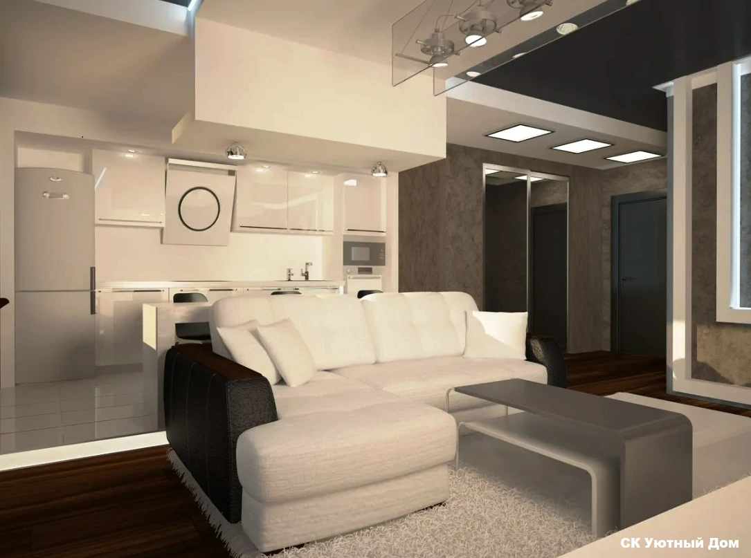 Одним из способов разделения пространства может стать использование разных полов или отделок на стенах. Например, зона спальни может быть выделена темным ламинатом или ковровым покрытием, в то время как гостиная будет иметь светлые отделочные материалы. Такой подход поможет визуально разделить пространство и сделает его более комфортным для использования. Можно использовать глянцевые натяжные потолки, они визуально расширяют пространство.