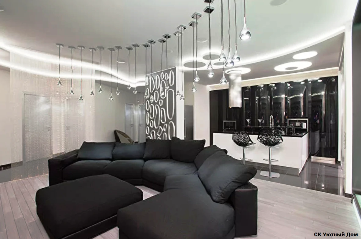 Одним из способов разделения пространства может стать использование разных полов или отделок на стенах. Например, зона спальни может быть выделена темным ламинатом или ковровым покрытием, в то время как гостиная будет иметь светлые отделочные материалы. Такой подход поможет визуально разделить пространство и сделает его более комфортным для использования. Можно использовать глянцевые натяжные потолки, они визуально расширяют пространство.