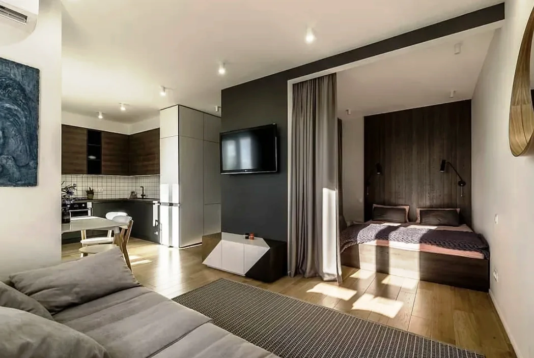 Одним из способов разделения пространства может стать использование разных полов или отделок на стенах. Например, зона спальни может быть выделена темным ламинатом или ковровым покрытием, в то время как гостиная будет иметь светлые отделочные материалы. Такой подход поможет визуально разделить пространство и сделает его более комфортным для использования. Можно использовать глянцевые натяжные потолки, они визуально расширяют пространство.