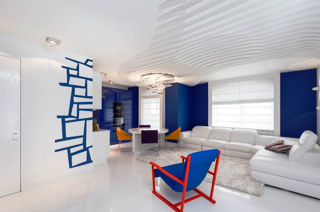 Одним из способов разделения пространства может стать использование разных полов или отделок на стенах. Например, зона спальни может быть выделена темным ламинатом или ковровым покрытием, в то время как гостиная будет иметь светлые отделочные материалы. Такой подход поможет визуально разделить пространство и сделает его более комфортным для использования. Можно использовать глянцевые натяжные потолки, они визуально расширяют пространство.