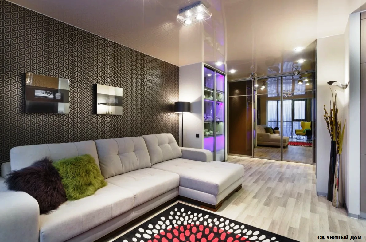 Одним из способов разделения пространства может стать использование разных полов или отделок на стенах. Например, зона спальни может быть выделена темным ламинатом или ковровым покрытием, в то время как гостиная будет иметь светлые отделочные материалы. Такой подход поможет визуально разделить пространство и сделает его более комфортным для использования. Можно использовать глянцевые натяжные потолки, они визуально расширяют пространство.