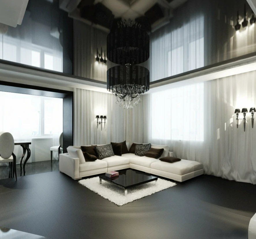 Одним из способов разделения пространства может стать использование разных полов или отделок на стенах. Например, зона спальни может быть выделена темным ламинатом или ковровым покрытием, в то время как гостиная будет иметь светлые отделочные материалы. Такой подход поможет визуально разделить пространство и сделает его более комфортным для использования. Можно использовать глянцевые натяжные потолки, они визуально расширяют пространство.