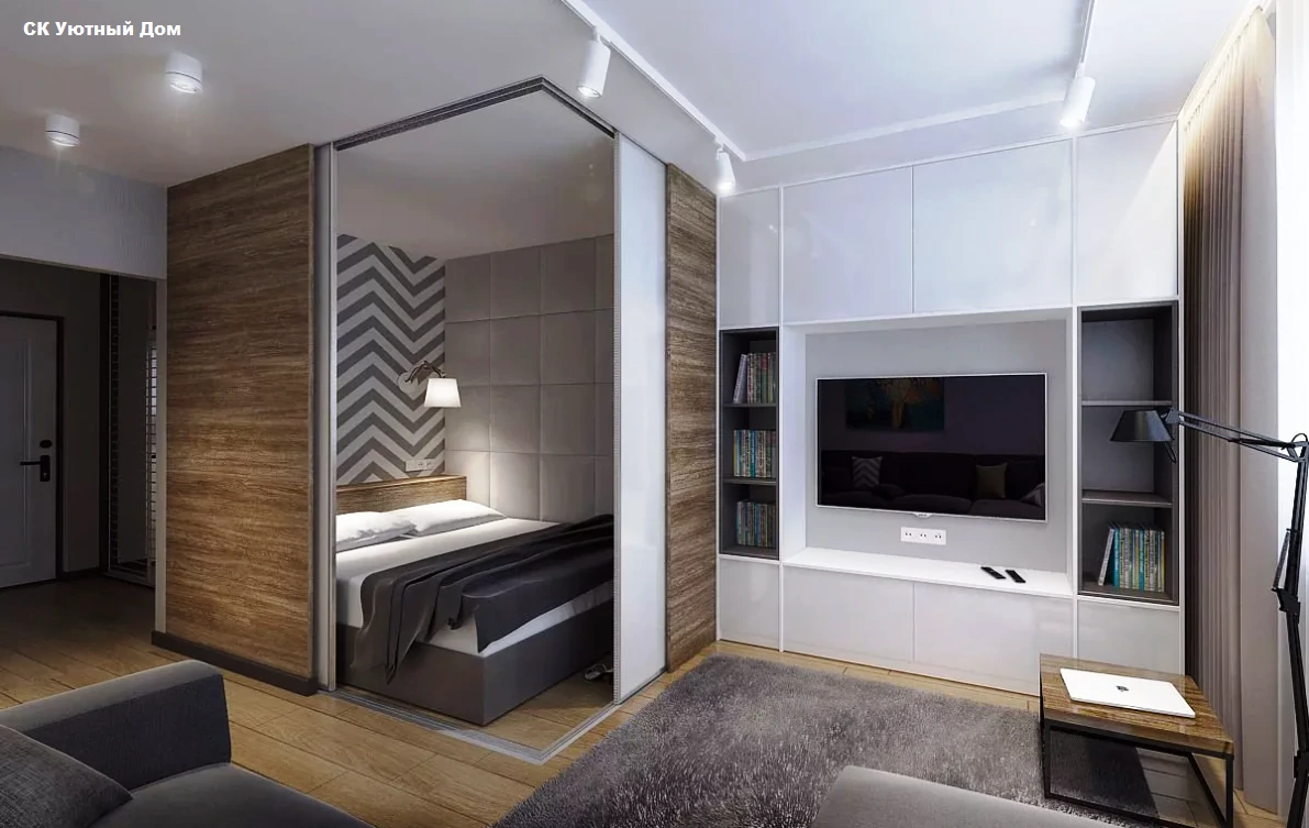 Одним из способов разделения пространства может стать использование разных полов или отделок на стенах. Например, зона спальни может быть выделена темным ламинатом или ковровым покрытием, в то время как гостиная будет иметь светлые отделочные материалы. Такой подход поможет визуально разделить пространство и сделает его более комфортным для использования. Можно использовать глянцевые натяжные потолки, они визуально расширяют пространство.