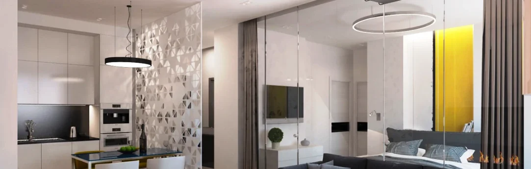Одним из способов разделения пространства может стать использование разных полов или отделок на стенах. Например, зона спальни может быть выделена темным ламинатом или ковровым покрытием, в то время как гостиная будет иметь светлые отделочные материалы. Такой подход поможет визуально разделить пространство и сделает его более комфортным для использования. Можно использовать глянцевые натяжные потолки, они визуально расширяют пространство.