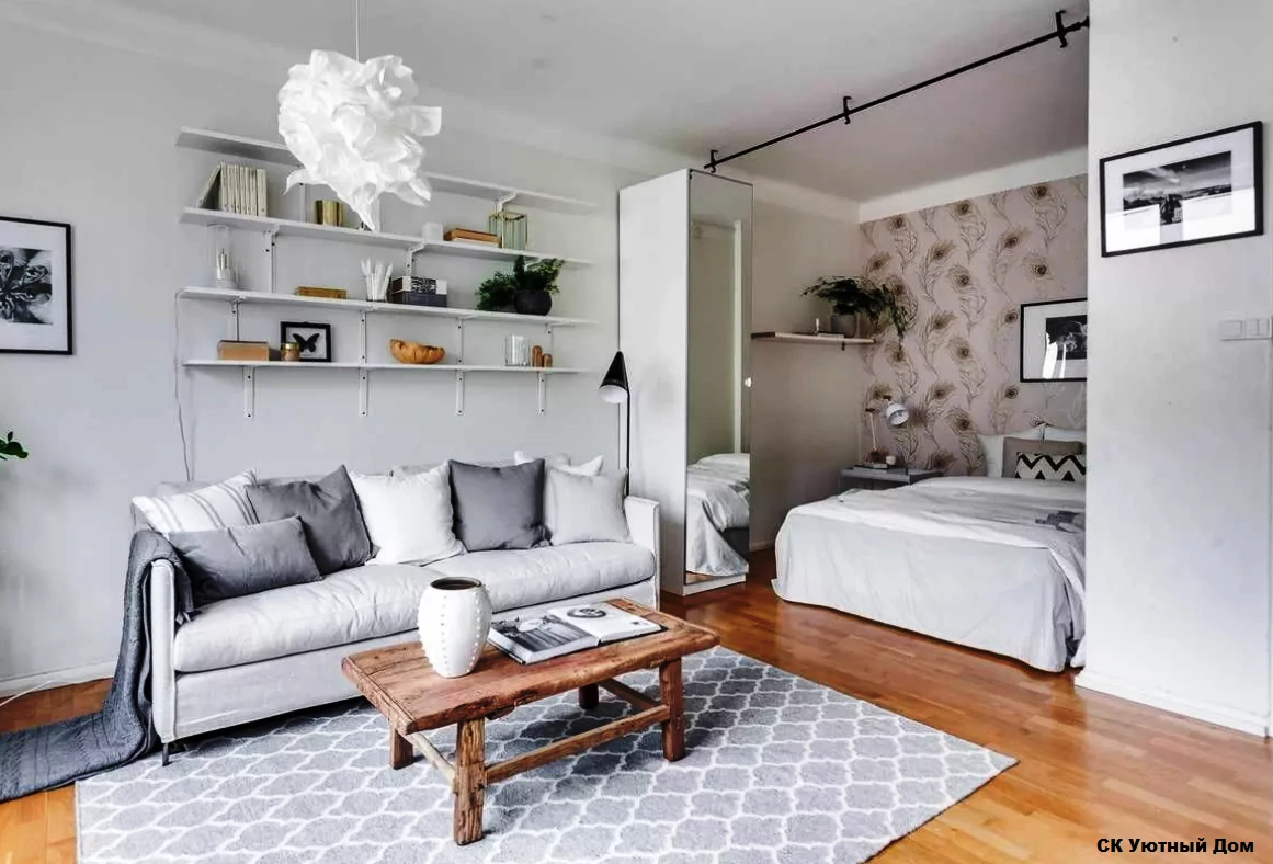 Одним из способов разделения пространства может стать использование разных полов или отделок на стенах. Например, зона спальни может быть выделена темным ламинатом или ковровым покрытием, в то время как гостиная будет иметь светлые отделочные материалы. Такой подход поможет визуально разделить пространство и сделает его более комфортным для использования. Можно использовать глянцевые натяжные потолки, они визуально расширяют пространство.