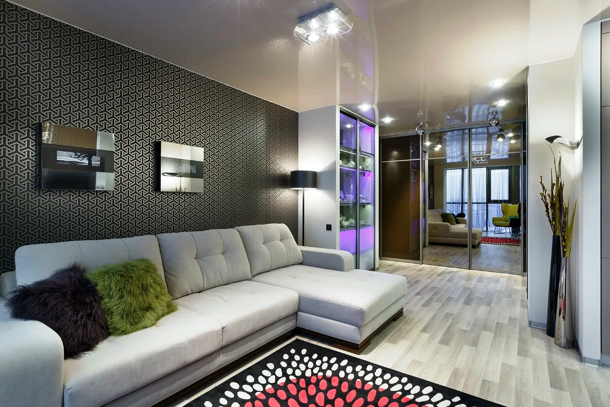 Одним из способов разделения пространства может стать использование разных полов или отделок на стенах. Например, зона спальни может быть выделена темным ламинатом или ковровым покрытием, в то время как гостиная будет иметь светлые отделочные материалы. Такой подход поможет визуально разделить пространство и сделает его более комфортным для использования. Можно использовать глянцевые натяжные потолки, они визуально расширяют пространство.