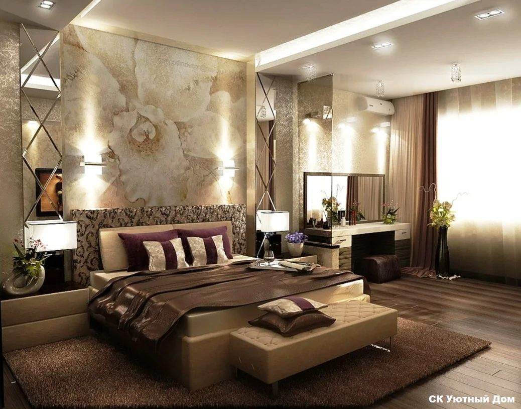 Одним из способов разделения пространства может стать использование разных полов или отделок на стенах. Например, зона спальни может быть выделена темным ламинатом или ковровым покрытием, в то время как гостиная будет иметь светлые отделочные материалы. Такой подход поможет визуально разделить пространство и сделает его более комфортным для использования. Можно использовать глянцевые натяжные потолки, они визуально расширяют пространство.