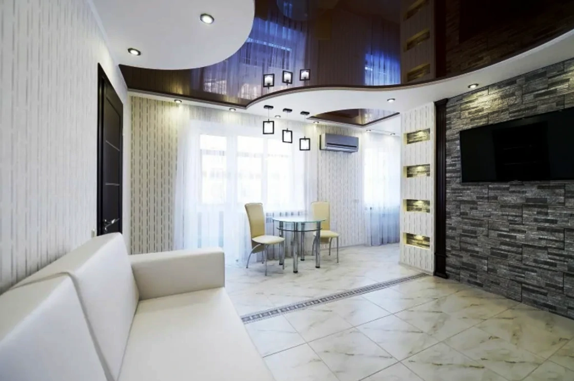 Одним из способов разделения пространства может стать использование разных полов или отделок на стенах. Например, зона спальни может быть выделена темным ламинатом или ковровым покрытием, в то время как гостиная будет иметь светлые отделочные материалы. Такой подход поможет визуально разделить пространство и сделает его более комфортным для использования. Можно использовать глянцевые натяжные потолки, они визуально расширяют пространство.
