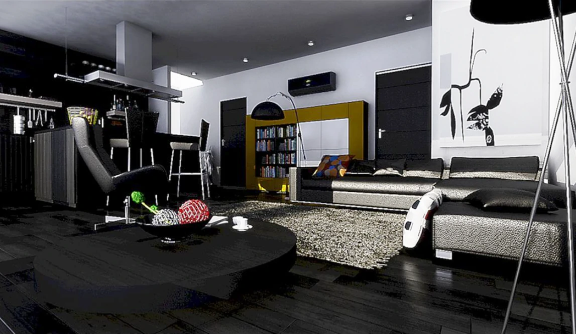 Одним из способов разделения пространства может стать использование разных полов или отделок на стенах. Например, зона спальни может быть выделена темным ламинатом или ковровым покрытием, в то время как гостиная будет иметь светлые отделочные материалы. Такой подход поможет визуально разделить пространство и сделает его более комфортным для использования. Можно использовать глянцевые натяжные потолки, они визуально расширяют пространство.