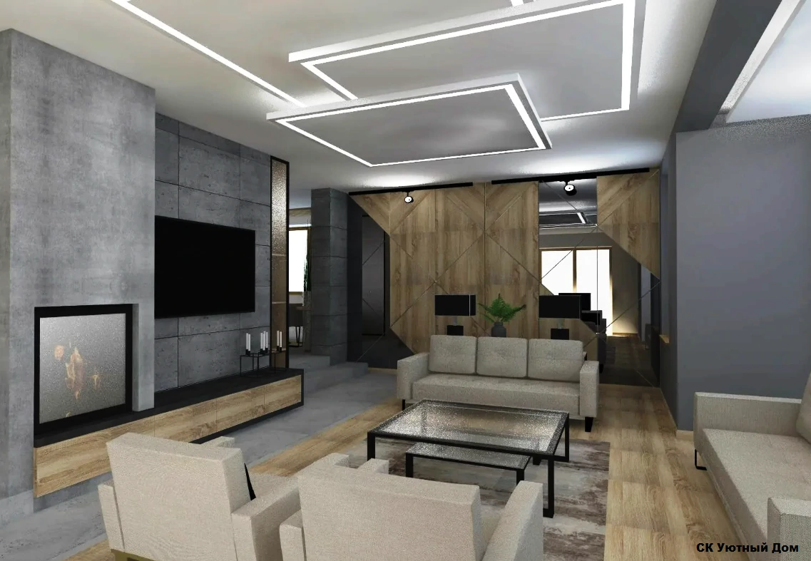 Одним из способов разделения пространства может стать использование разных полов или отделок на стенах. Например, зона спальни может быть выделена темным ламинатом или ковровым покрытием, в то время как гостиная будет иметь светлые отделочные материалы. Такой подход поможет визуально разделить пространство и сделает его более комфортным для использования. Можно использовать глянцевые натяжные потолки, они визуально расширяют пространство.